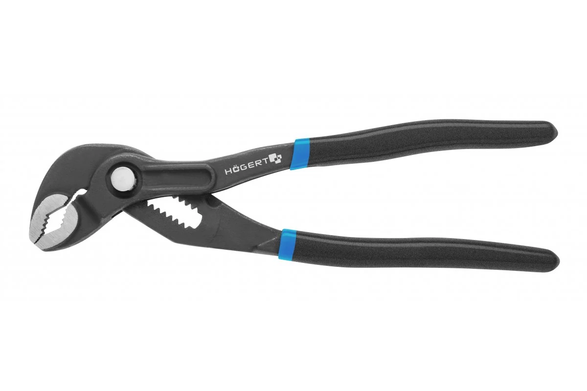 Hidraulikus és szerelési munkákhoz való fogó. A pofák gyors és precíz beállítása a rugós blokád megnyomása által. A fogó markolata műanyaggal borított.