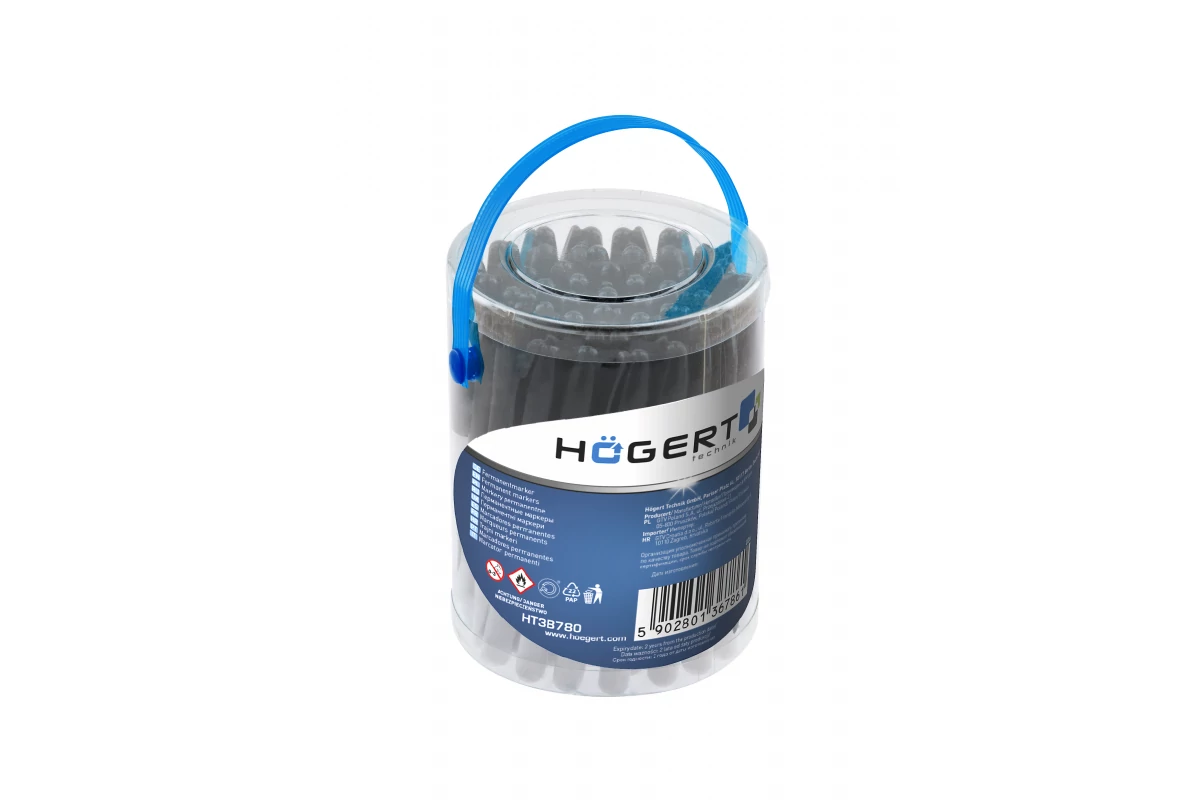 Fekete tartós filctollkészlet, amely könnyen zsebben tartható, egy további fogantyú pedig lehetővé teszi, hogy a termék elvesztésének megakadályozása érdekében felakasztható legyen. Alkalmas fa-, acél- és betonfelületekre való íráshoz.