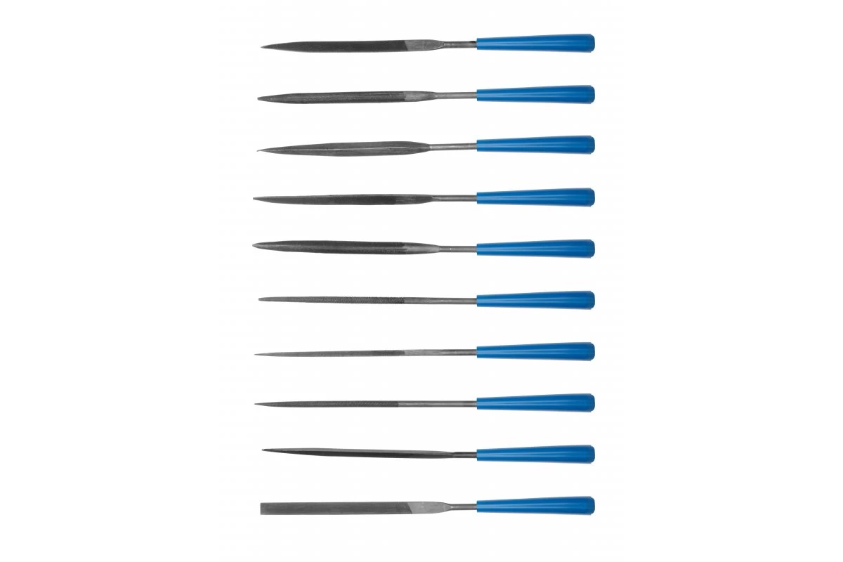 Tűreszelők üveg, kerámia, fa és fém kivitelezési munkákhoz. 10 különböző alakú acél tűreszelő. Használhatók az ékszerész-, órakészítő- és vésnökiparban.