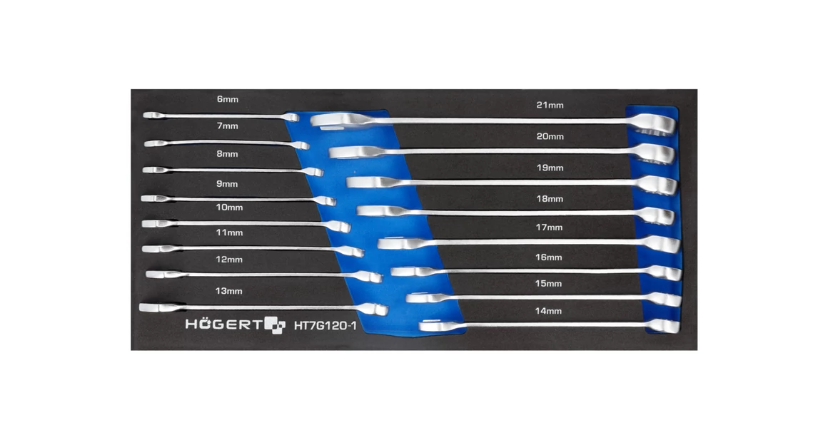 Szerszámos szekrénybe tehető betét laposszemű kulcsok készletével.