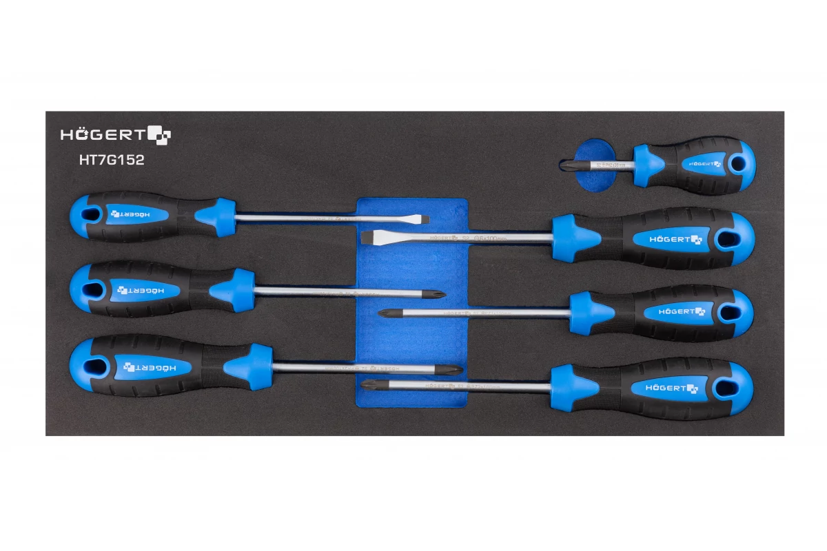 Lapos fejű, Phillips és Pozidrive csavarhúzókat tartalmazó szerszámos szekrénybe helyezhető készlet. A gondosan kiválasztott eszköz készlet minden szakemberek szerszámos szekrényének fontos része.