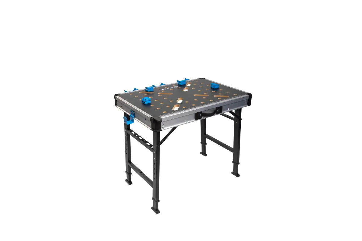 A multifunkcionális összecsukható munkapad MDF asztallapján található rögzítőfuratokkal és 3 rekesszel sokoldalúságot és rendezettséget biztosít a munkahelyen. Az oldalsó merevítőkben található lyukak és fészkek megkönnyítik a csavarok, anyák, kisebb szerszámok stb. elérését. A 6-szintű magasságállítás minden magasságú és igényű felhasználó számára alkalmassá teszi. A speciális összekötők lehetővé teszik két asztal egymáshoz rögzítését, így nagyobb munkaterület érhető el. A 2 asztal bakként/támasztóként való használata és a szorítók egyidejű használata lehetővé teszi a hosszú munkadarabok stabil megmunkálását. Az oldalsó horgok lehetővé teszik hosszú gerendák két asztalra való felakasztását. A rögzítőcsapok lehetővé teszik a munkadarabok biztonságos rögzítését. Akár 450 kg-os teherbírása alkalmassá teszi az asztalt a valóban nehéz feladatokhoz. Az MDF asztallap tartós és nedvességálló. Az asztal szerkezetében használt masszív acél garantálja a szerszám robusztusságát és tartósságát. Az összecsukható kialakítás kompakt méretet biztosít, így könnyen tárolható és szállítható. Kinyitva kis méretei alkalmassá teszik szűk helyeken és helyiségek sarkaiban való használatra.