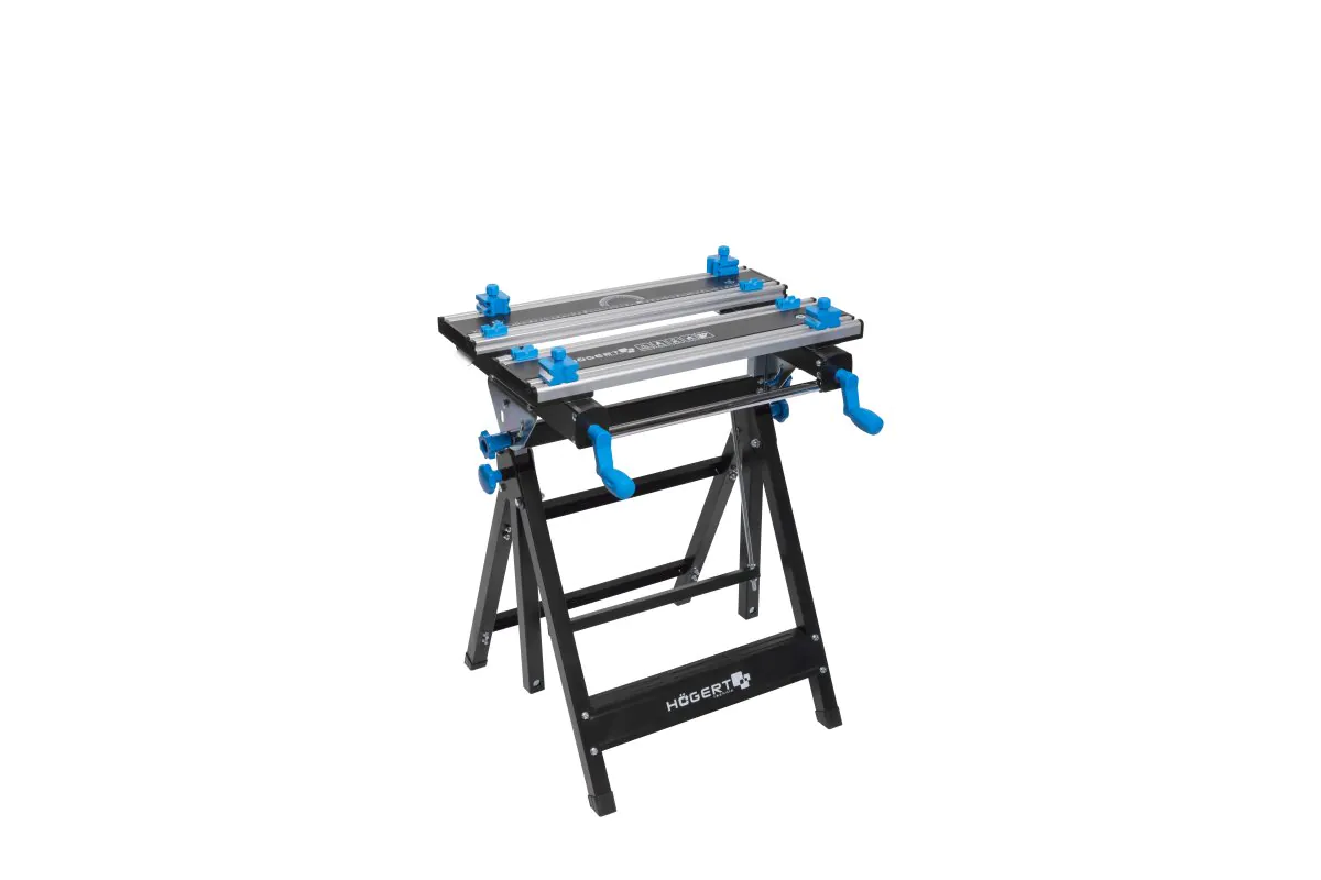Az állítható fém munkapad sokoldalúságot biztosít a munkához. A munkafelület szögének 4 fokozatú beállítása ergonómiát és optimális munkakörülményeket biztosít. A magasság 7 fokozatú beállítása lábbal lehetővé teszi a szerszám alkalmazkodását a változó igényekhez. A tartógerendák helyzetének sima beállítása növeli a rögzítési területet. A fogantyú egy nyomással beállítható a tárgyak egyenetlen széleihez. A 8 csúszó szorítópofa további, biztonságos rögzítést biztosít különböző alakú munkadarabokhoz, például csövekhez, tömbcsapokhoz, lemezekhez. Az asztallap 100 kg-os maximális terhelhetősége lehetővé teszi a nehéz tárgyakkal való munkát. Az összecsukható kialakítás kompakt méretet biztosít a szerszámnak, ami megkönnyíti a tárolást és a szállítást. Az asztallap és az asztal szerkezetében használt masszív acél és ellenálló, könnyű alumínium garantálja a szerszám robusztusságát és tartósságát. A csúszásgátló gumitalpak stabilitást biztosítanak a munkához. A rúdra nyomtatott hossz- és szögméretek megkönnyítik a munkadarabok vágását és összeszerelését.