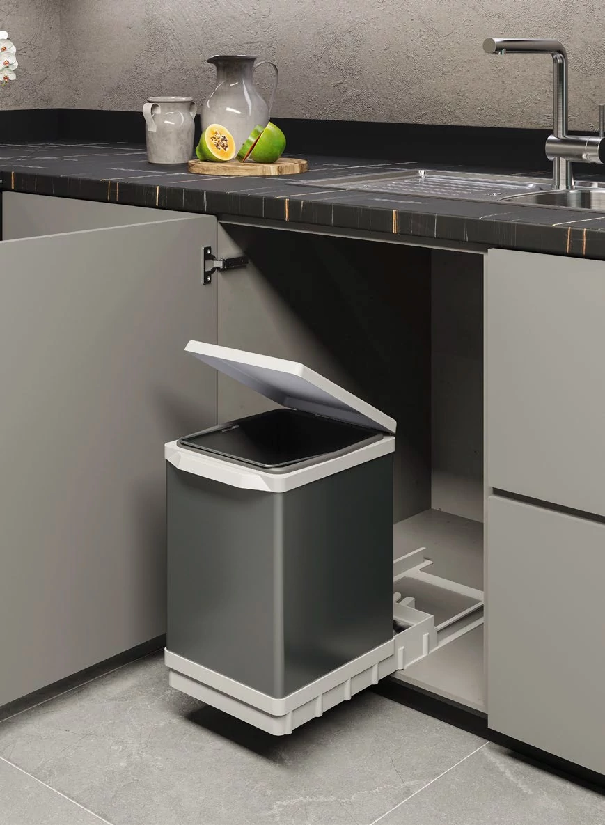 Beépített hulladéktároló kihúzható edényekkel tartós műanyagból.