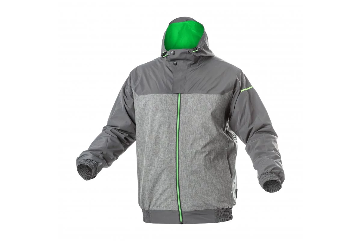 - anyaga: szürke szövet 100% poliészter, szürke melange szövet, 96% poliészter + 4% elasztán TPU membránnal; - vízállóság 5000 mm H2O, légáteresztő képesség 800 g/m²/24 óra; - ragasztott varratok; - bélés: 100% poliészter 210T tafetta, 50 g; - cipzáras zárás; - 2 alsó zseb, 1 belső irattartó zseb; - teljes kapucnit állítani lehet magasságban és mélységben; - gumiszalag a kabát és az ujjak alján; - divatos sötétszürke szín, zöld betétekkel – a szövet megtartja színintenzitását az ismételt mosás ellenére is
