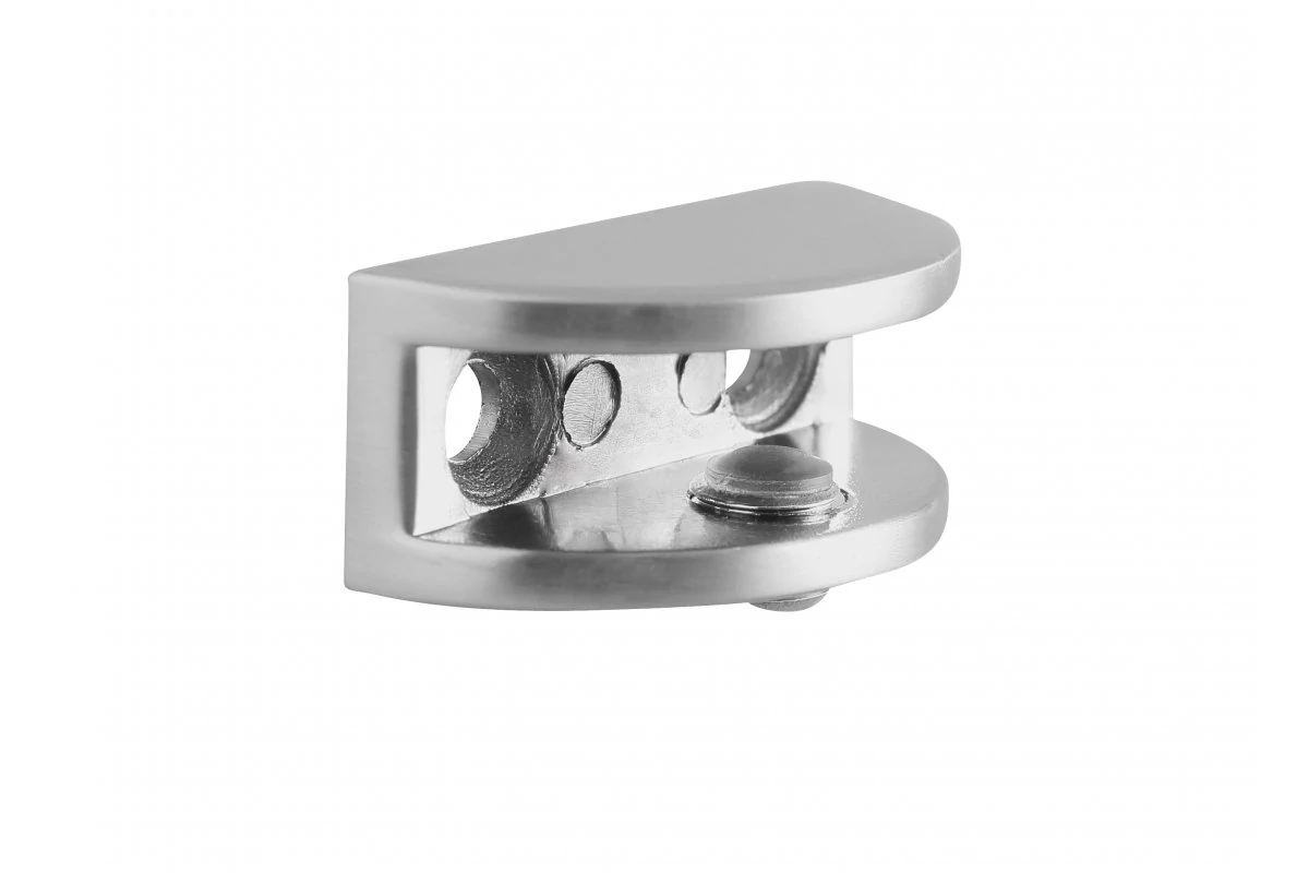 Két csavarral rögzíthető támasztó, ZnAl ötvözetből készült, két színváltozatban kapható. 5-8 mm vastagságú üvegpolcok rögzítésére tervezve.