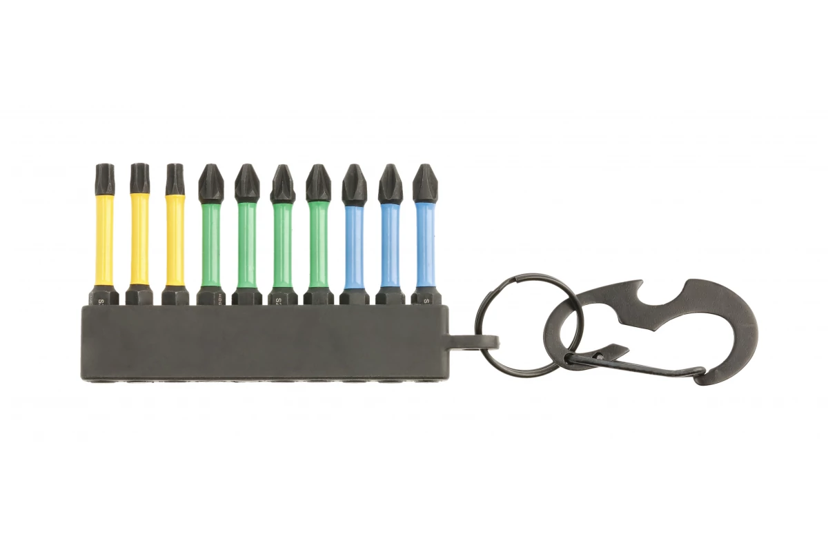 Egy 10 darabból álló készlet, amelyet többek között 1/4"-os tokmányú ütvecsavarozókhoz és fúró/ csavarhúzókhoz terveztek. A nagy igénybevételnek való megfelelés érdekében kiváló minőségű, edzett S2 ötvözött acélból készültek. A fém összetétele, amelyből a szerszámok készülnek, ellenállóbbá teszi őket a csavarra ható erő átvitelekor a torzióval szemben, ami azt jelenti, hogy nagyobb nyomatékkal is működhetnek. A munkadarab hő- és mechanikai kezelésének technológiája a szerszámokat kellően rugalmassá teszi az ütések elnyeléséhez. A mágneses végek megkönnyítik a csavarokkal való munkát. A praktikus csomagolás egy kiegészítő kampóval (karabiner) megkönnyíti a bitek tárolását és szállítását.