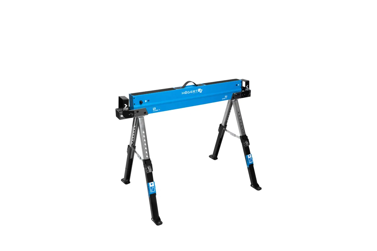 Állítható, összecsukható, strapabíró munkabak a munkához kapcsolódó sokoldalúságért. A 9 fokozatú magasságállítás lehetővé teszi a szerszám ergonomikus alkalmazkodását a változó igényekhez. A 2 bak alkotja a mobil munkaasztal szerkezetét. Mindkét végén rácsos/gerendatartókkal vannak felszerelve, amelyek segítségével stabil szerkezet építhető a munkalaphoz két külön megvásárolható bak segítségével. A konzolok 40 mm-től 90 mm-ig fokozatmentesen állíthatók, hogy különböző méretű gerendákhoz illeszkedjenek. A munkaasztal teljes stabilizálása érdekében például az OSB lap csavarokkal rögzíthető a gerendákhoz. Összességében ez lehetővé teszi további munkaterület kialakítását bárhol. Egyetlen tartó maximális terhelhetősége 530 kg, ami lehetővé teszi nagy tárgyak kezelését. Munkaasztal beállításakor figyeljen az asztallap teherbírására. A összecsukható lábtámaszok lehetővé teszik, hogy kis keresztmetszetű gerendákat/léceket/gerendákat vagy majdnem függőleges OSB-t vagy gipszkartont helyezzen rájuk. Az egyedileg állítható lábaknak köszönhetően a bak egyenetlen felületeken is stabilan áll. A csúszásgátló felület biztosítja, hogy a munkadarabok vagy az asztallap ne csússzon el. A munkaasztal teljes stabilizálása érdekében például az OSB lap csavarokkal rögzíthető a keretoszlophoz. Az összecsukható kialakítás kompakt méretet biztosít a szerszámnak, így könnyen tárolható, és könnyű súlya és fogantyúja révén könnyen szállítható. A szállítóeszköz szerkezetében használt strapabíró acél,