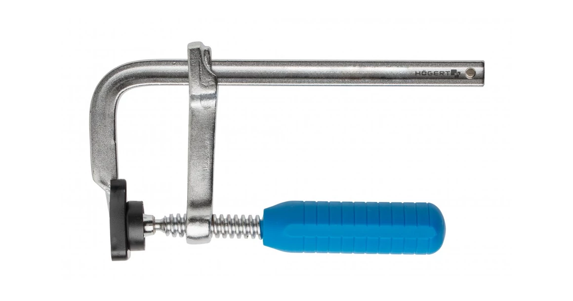 Egy acéldarabból kovácsolt asztalos szorító, mely az asztalos és lakatos munkák során helyszíni rögzítést biztosít, pl. ragasztáskor